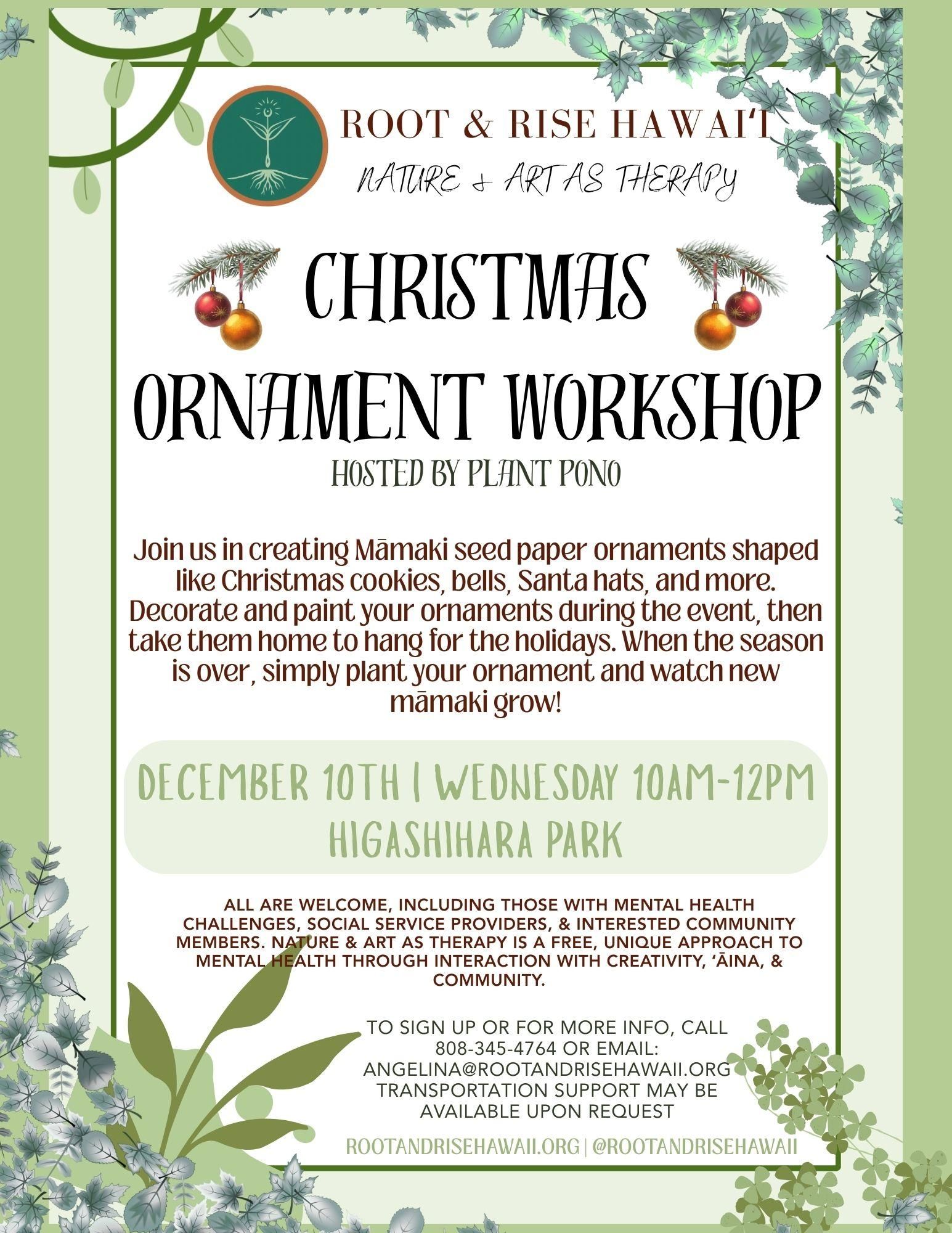 Join us in creating Māmakī seed paper ornaments shaped like Christmas cookies, bells, Santa hats, and other festive designs. During this workshop, you’ll have the opportunity to decorate and paint your ornaments while enjoying the creativity and calm of our Nature & Art as Therapy program. Once the holiday season is over, simply plant your ornament and watch new māmakī grow—an uplifting way to carry this season’s joy into the new year.