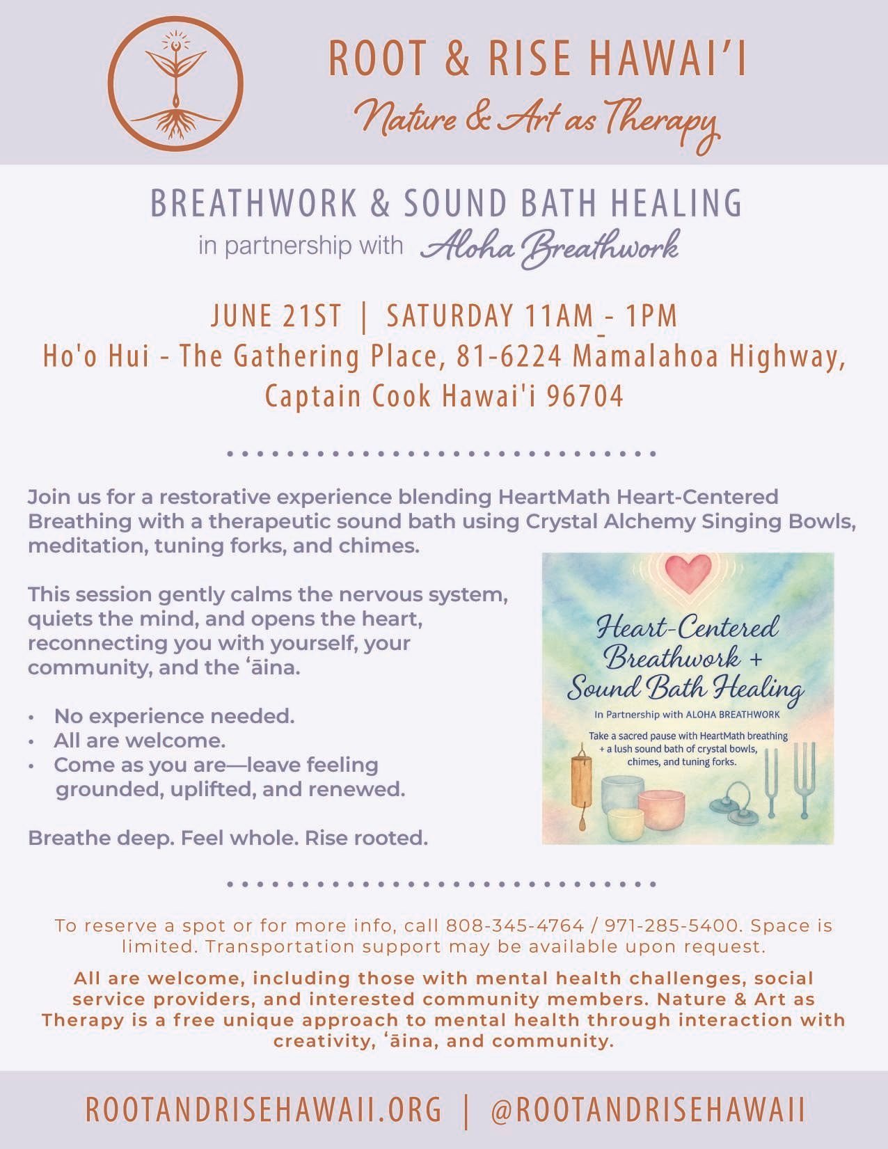 This program, designed for adults experiencing mental health challenges, integrates ʻāina, self-expression, community, and service to support healing and mental well-being. Through guided workshops led by experienced facilitators, participants engage in activities that encourage creativity, mindfulness, and connection to ʻāina (land, that which provides), aligning with Root & Rise Hawaiʻi's core values of growth and aloha ʻāina. Nature & Art as Therapy is built upon principles of trauma-informed care, including empowerment, choice, collaboration, safety, and trust.